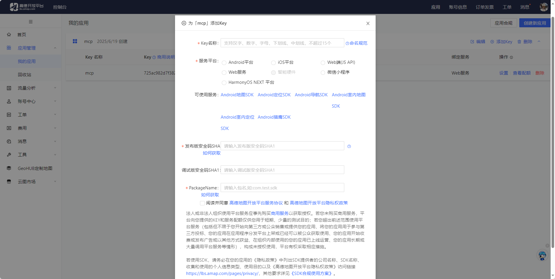 [https://console.amap.com/dev/key/app](https://console.amap.com/dev/key/app)创建API KEY