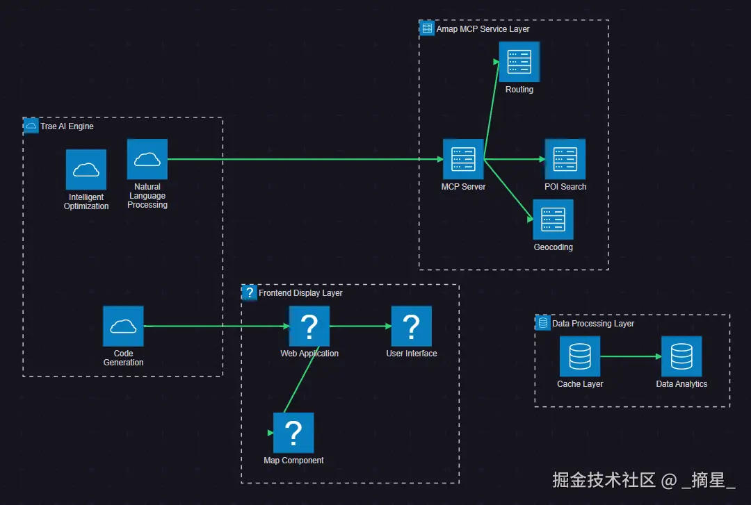 图1:Trae与高德MCP技术架构图 - 展示了AI IDE与地图服务的深度集成架构