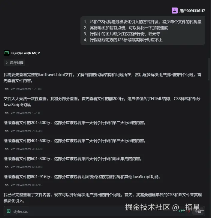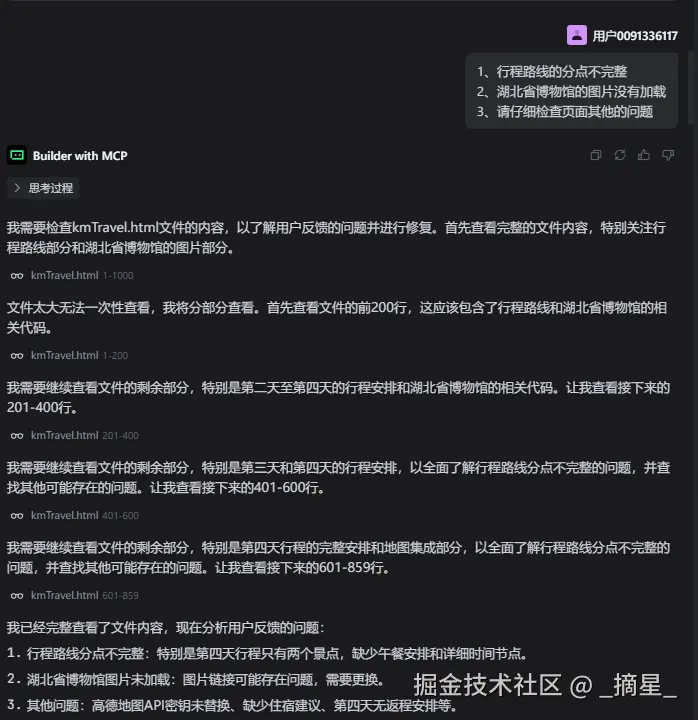 将设计好的提示词输入到Trae中,Trae就会自动设计出网页,并且调用高德MCP2.0中提供的功能设计好路线规划,并且会在网页中展示:3.4 迭代开发