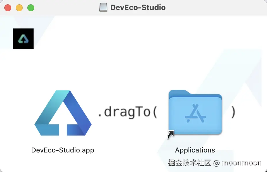 在安装界面中,将“DevEco-Studio.app”拖拽到“Applications”中,等待安装完成。