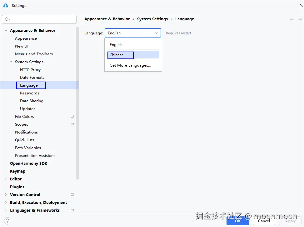 - 从DevEco Studio 6.0.0 Beta1版本开始,中文化插件无需下载,默认安装开启。如需切换DevEco Studio语言显示效果,在菜单栏进入File > Settings... (macOS为DevEco Studio > Preferences/Settings ) > Appearance & Behavior > System Settings > Language,语言选择Chinese并点击Apply,在弹窗中点击Restart重启即可完成语言切换。