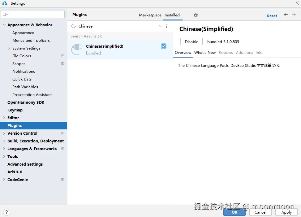 - 若使用DevEco Studio 6.0.0 Beta1之前版本,请在菜单栏进入File > Settings (macOS为DevEco Studio > Preferences ) > Plugins,选择Installed页签,在搜索框输入“Chinese”,搜索结果里将出现Chinese(Simplified) ,在右侧单击Enable,点击OK,在弹窗中单击Restart,重启DevEco Studio后即可生效。