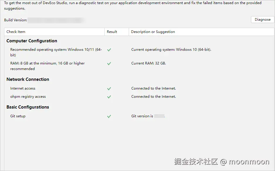 DevEco Studio开发环境诊断项包括电脑的配置、网络的连通情况、依赖的工具是否安装等。如果检测结果为未通过,请根据检查项的描述和修复建议进行处理。
