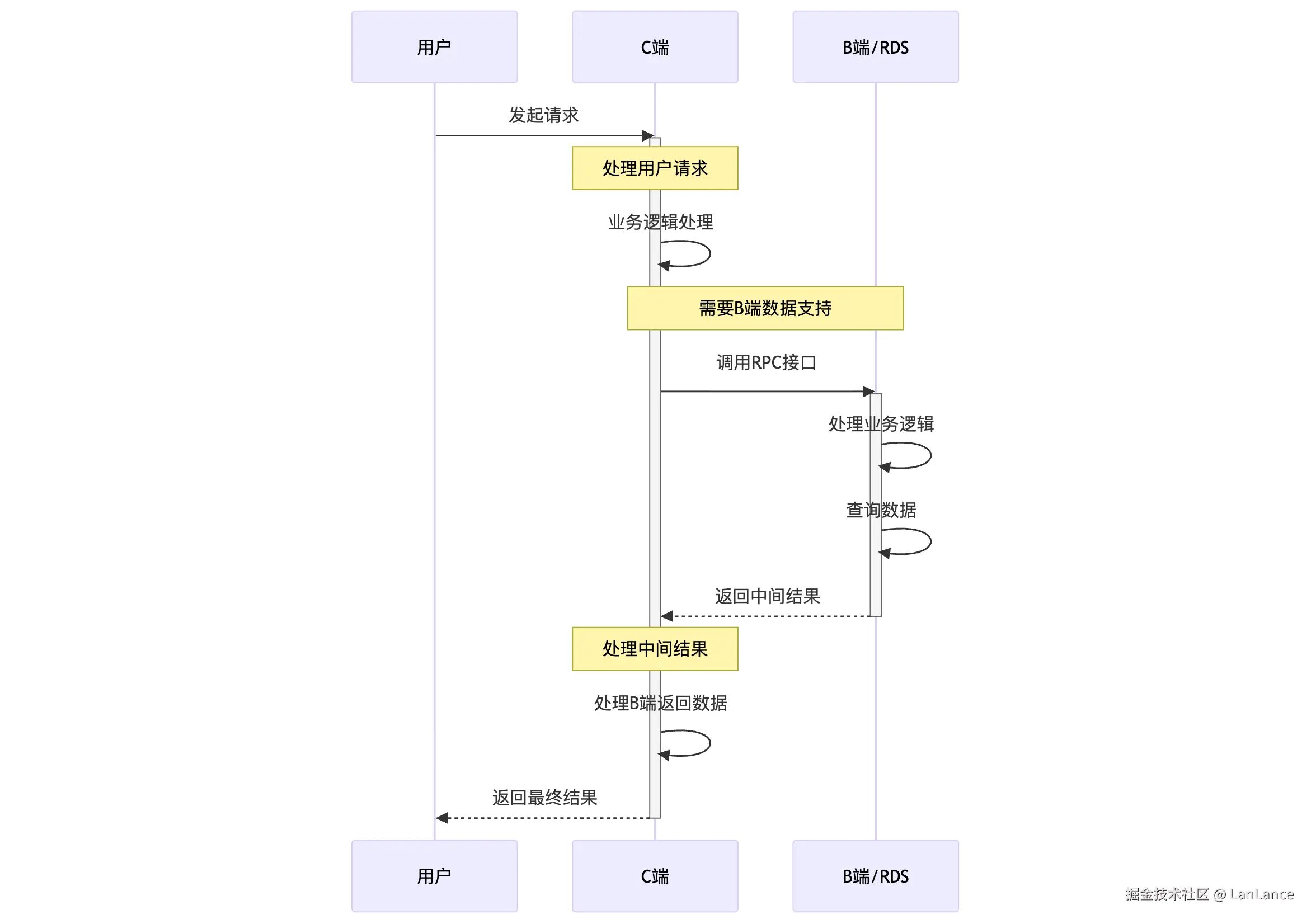 由 C 端服务直接打到 DB 中,B 端/DB 的 QPS 与 C 端请求 1:1。同时整个链路会因为多一次 RPC 调用以及序列化反序列化的操作,加大延时。若下游还是使用的 JDK8 甚至会有长尾问题,TP999 不可接受。但优点是完全没有一致性问题。