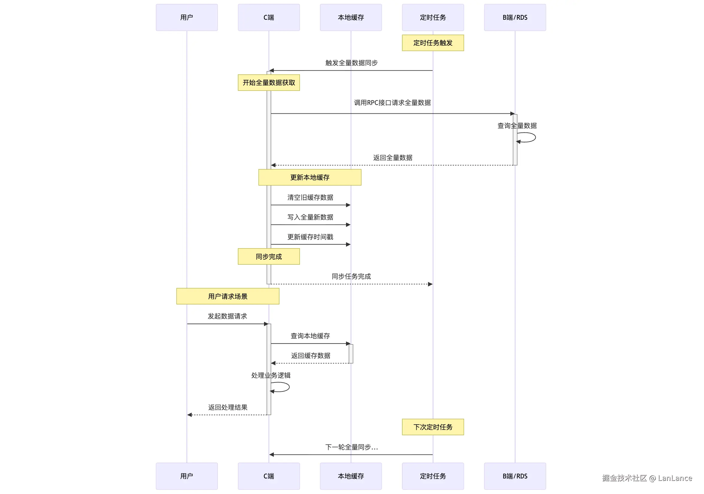 通过一个定时任务将 DB 数据同步到本地缓存中,缓存数据与 DB 数据一致,但需要接受一定延时(秒级)。系统访问本地缓存无需调用远端,几乎零耗时。但存储瓶颈由内存决定,成本较高。