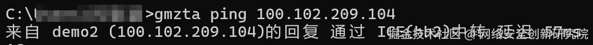 当使用电脑ping一台用于测试的设备demo2时,输入命令:gmzta ping [目标设备IP],此时看到设备通过ICE中转,表明采用的是中转方式。