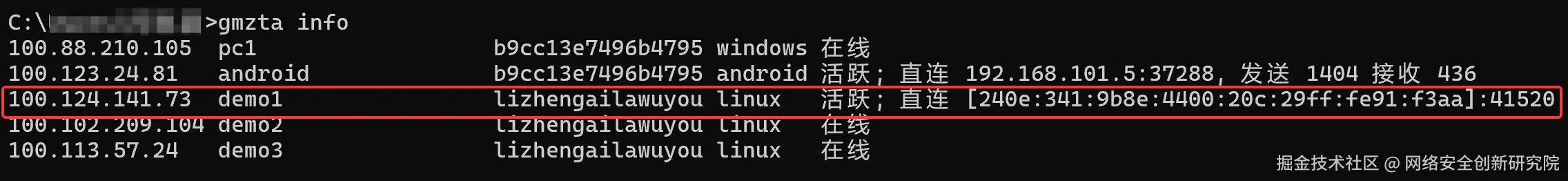 另外,也可以输入命令:gmzta info,查看所有设备的连接状态。在该命令的输出结果中,会明确标注每个设备是采用直连还是经过云路由(ICE)中转。