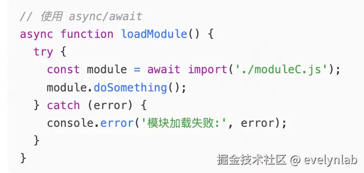 Dynamic Imports(动态导入)是 ECMAScript 2020 中引入的一个重要特性,它允许开发者在运行时按需加载 JavaScript 模块。 在代码执行到该语句时才会开始加载模块,返回一个 Promise