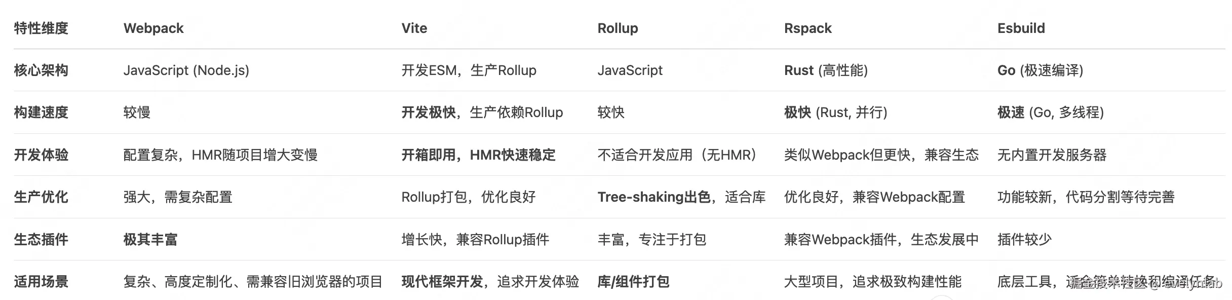 webpack rollup vite rspack esbuild 分别有哪些功能是其他几个没有的?