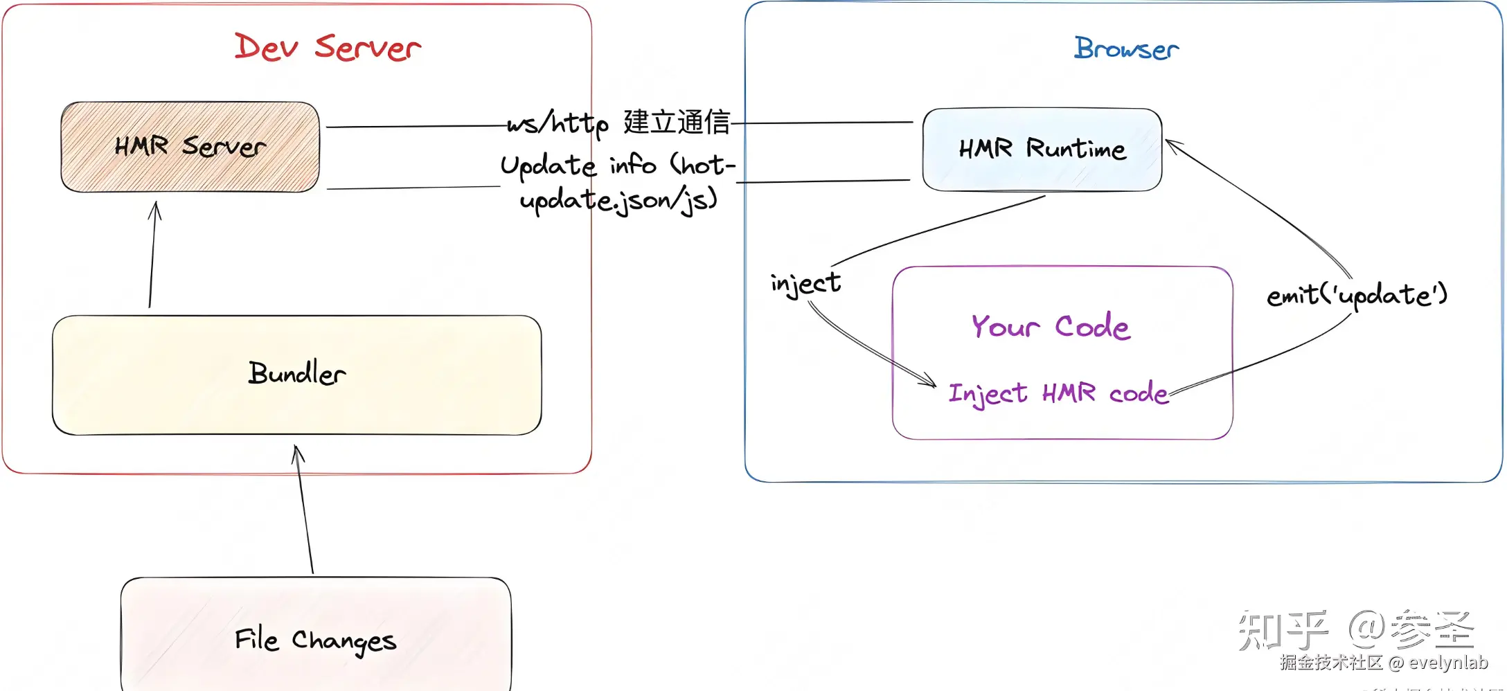 - 浏览器的 HMR Runtime(已被注入到打包的代码中)接收到消息后,动态拉取更新后的代码模块,并替换掉正在运行的老模块,实现页面无刷新更新,保持应用状态。