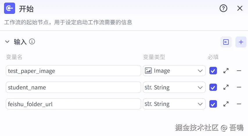 工作流不算复杂,前面是三个大模型节点,分别用于试卷内容读取、试卷批改以及错题集整理;后面的这些节点主要是用来把大模型产生的结果写入到飞书文档中,下面对各个节点做下详细的解读。