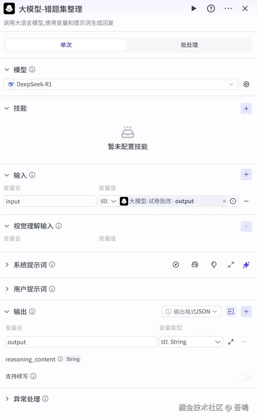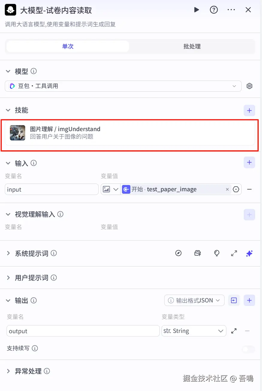 - input:试卷内容,引用”大模型-试卷内容读取“输出的”output“