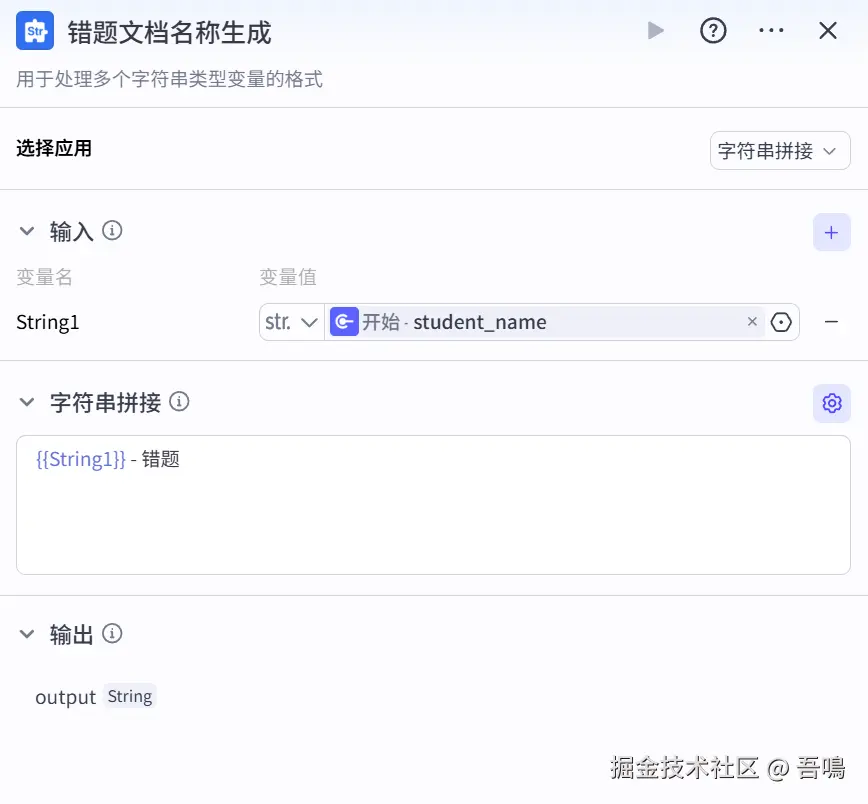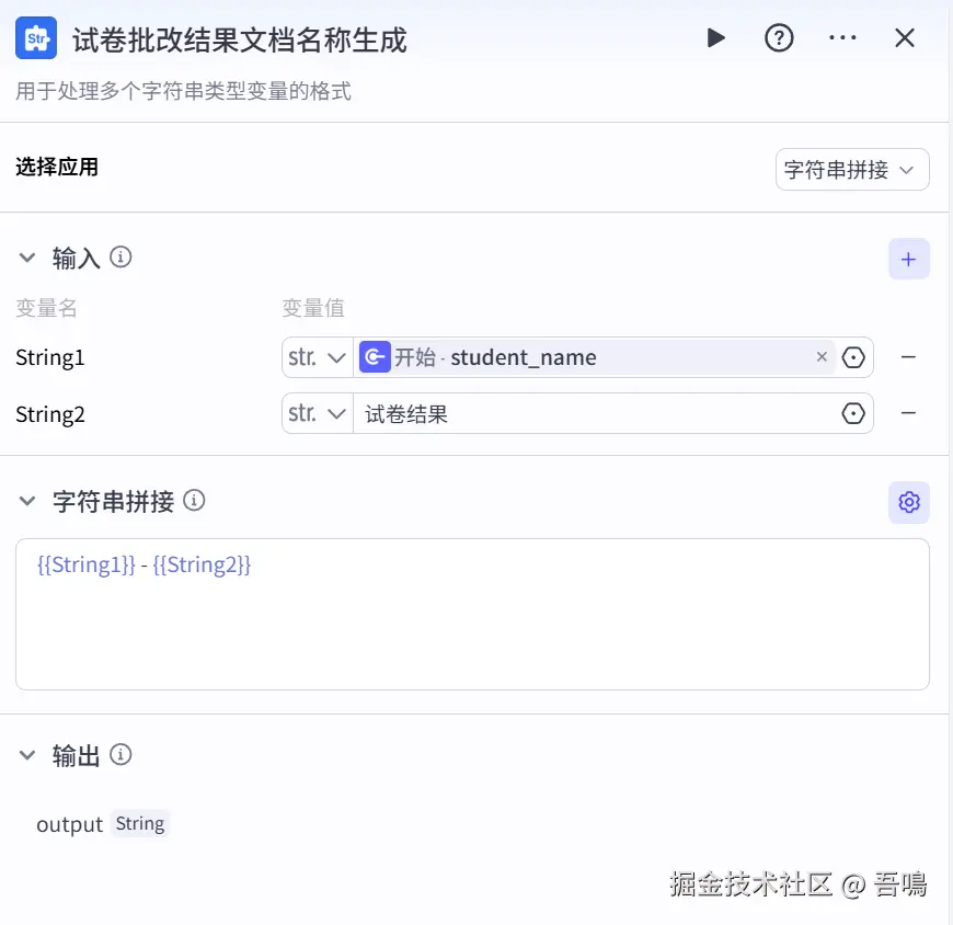 这个用到了扣子官方的节点”文本处理“,用于生成试卷批改结果飞书文档的名称。