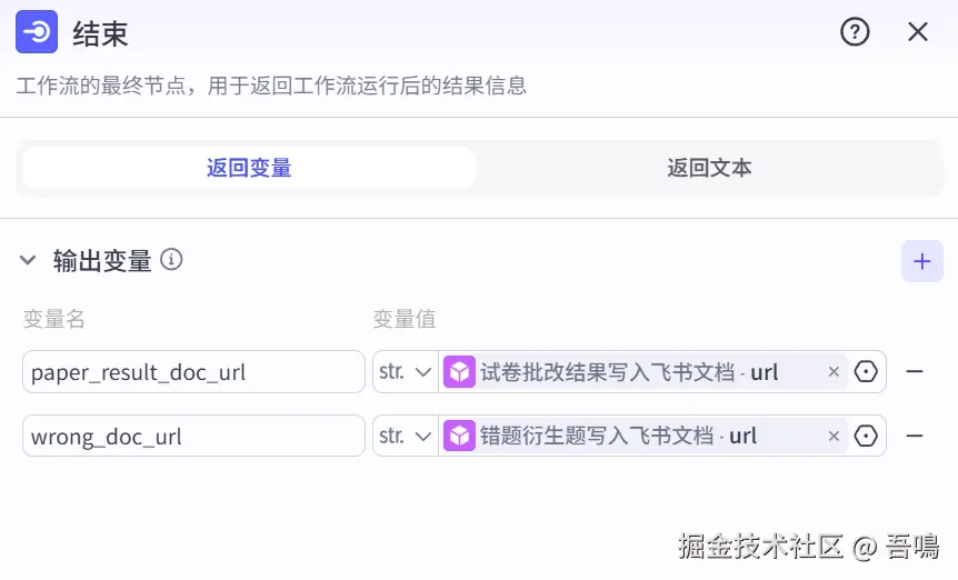 - title:飞书文档名称,引用”试卷批改结果文档名称“节点的”output“