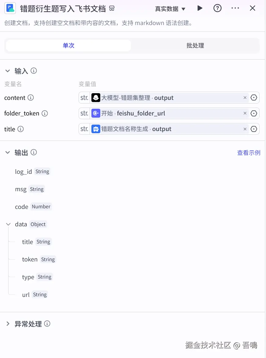 - content:飞书文档的内容,引用”大模型-试卷批改“输出的”output“