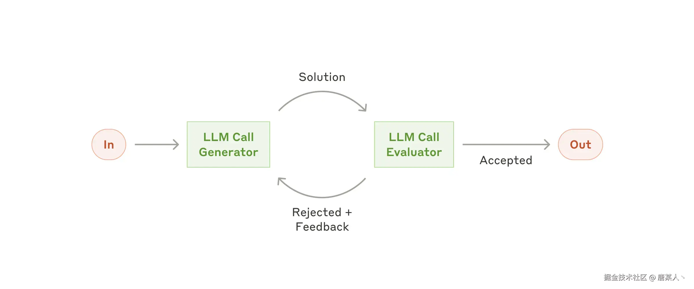 在评估器-优化器工作流程中,一个大语言模型调用生成回复,而另一个则在循环中提供评估和反馈。
