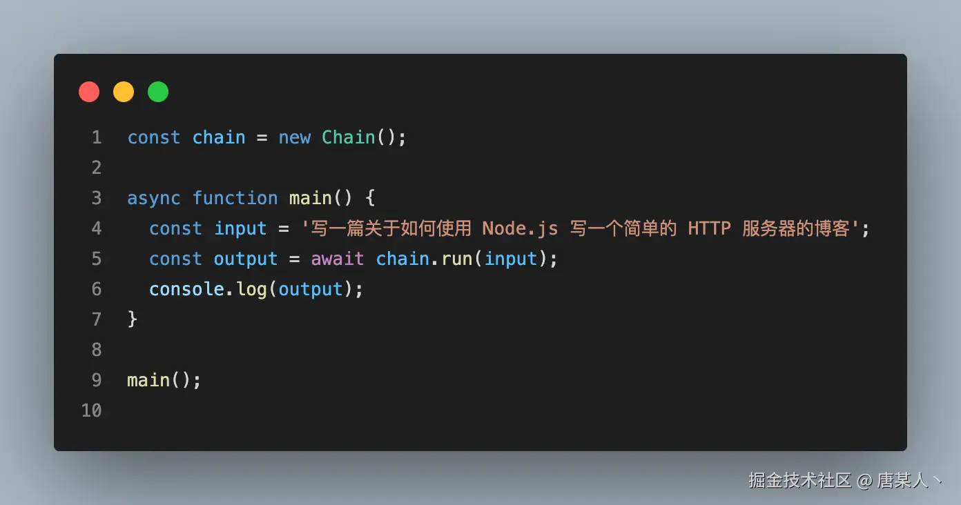 那这些 LLM 节点是怎么被组织成工作流的呢?其实就是通过代码里面的 if/else/switch/for控制的。例如我们基于链式的工作流,实现一个翻译英文文档再总结提炼的工具