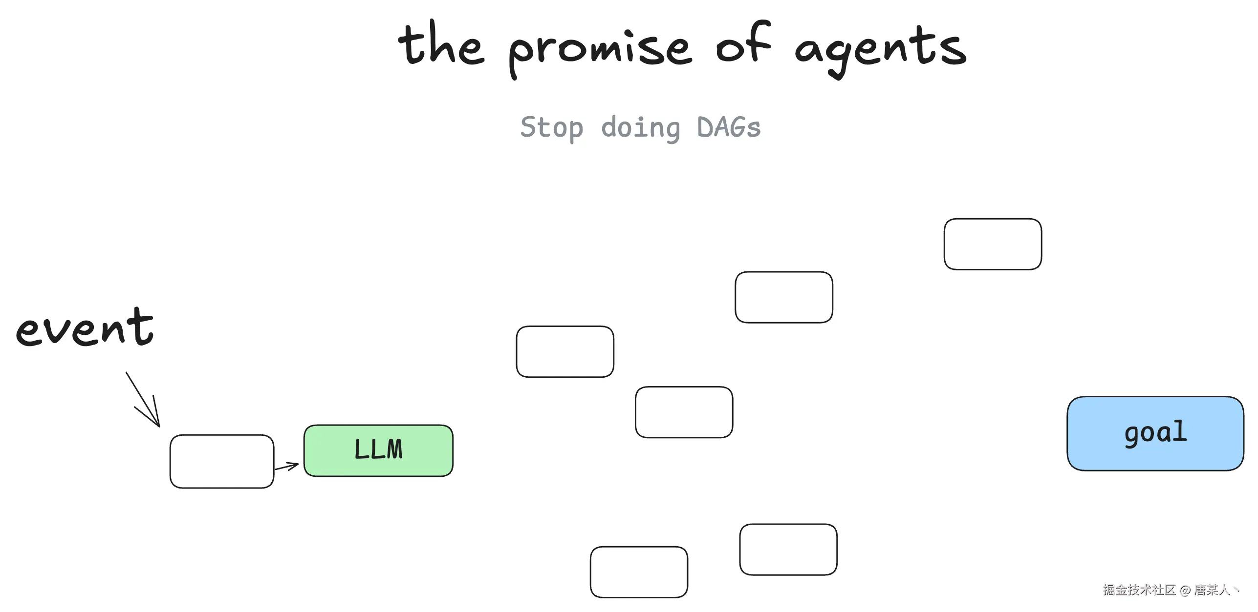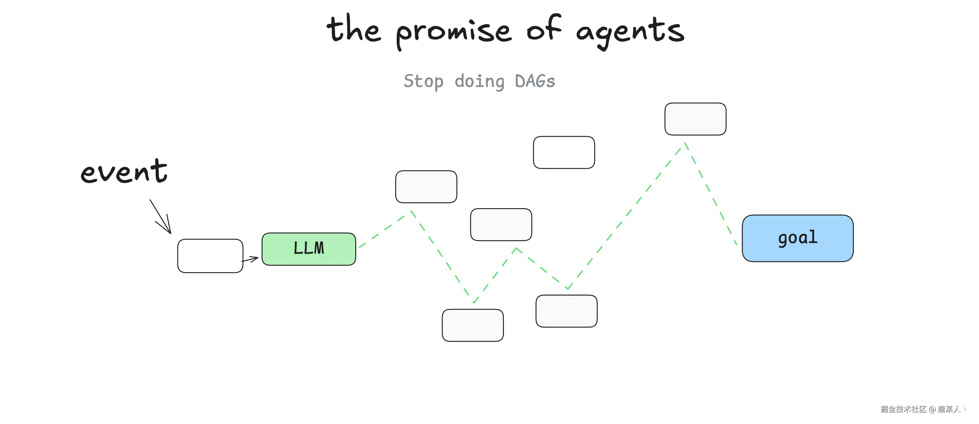 我并不是第一个这么说的人,但当我开始学习智能体时,最大的收获是你可以抛开有向无环图了。不再需要软件工程师编写每一个步骤和边缘情况,你只需给智能体一个目标和一系列转换规则即可