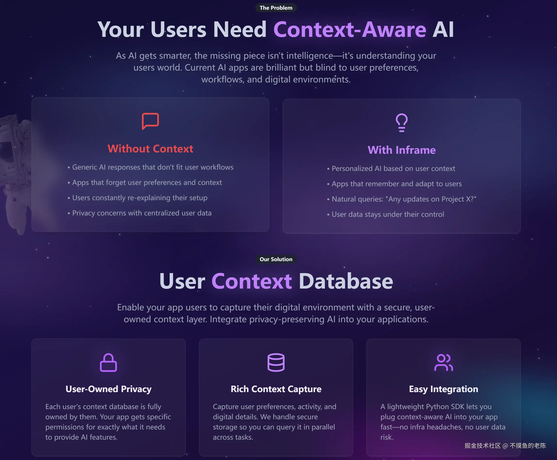 Inframe是一款Python SDK,帮助开发者为应用程序添加上下文收集和查询功能,提供AI代理用户上下文,同时确保用户隐私。