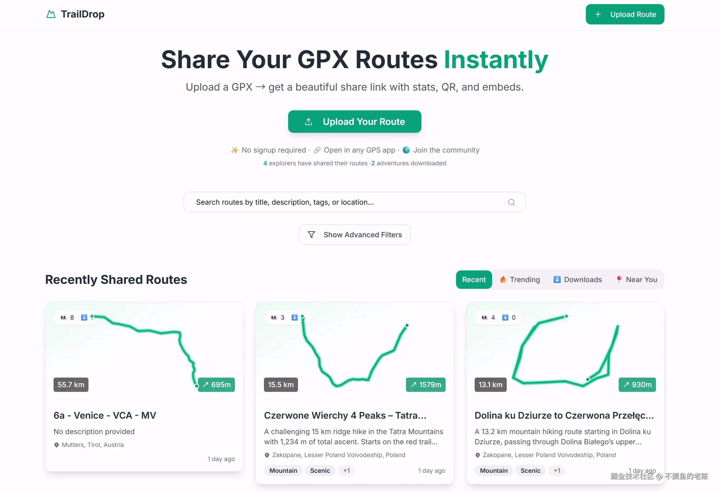 TrailDrop是一款GPX路线分享应用,用户可以上传GPX文件后获得即时分享链接,接收者无需注册即可查看地图、坡度、海拔等信息。