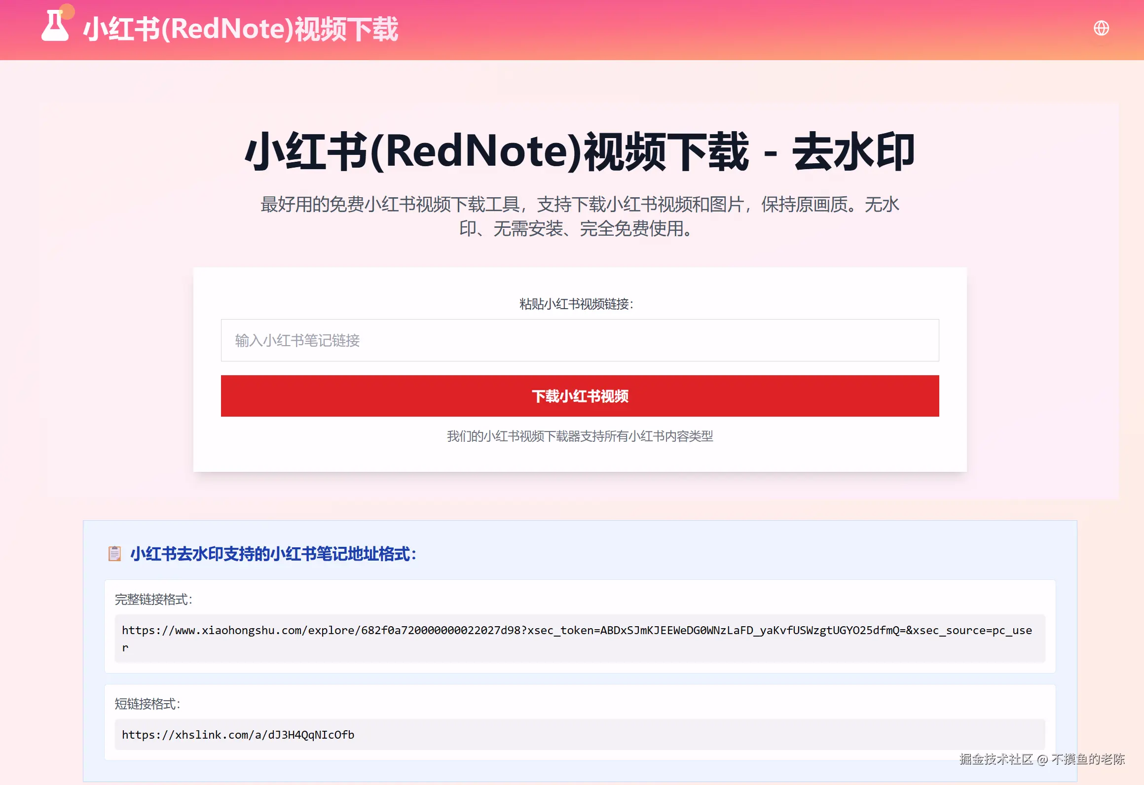 小红书视频下载是一款免费在线小红书视频和图片下载工具,支持无水印、高清和4K画质的下载,使用方便,无需注册。