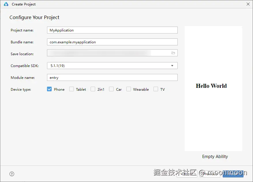 选择Application应用开发(本文以应用开发为例,Atomic Service对应为元服务开发),选择模板Empty Ability,单击Next进行下一步配置。
