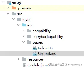 新建第二个页面文件。在Project窗口,打开entry > src > main > ets,右键单击pages文件夹,选择New > ArkTS File,命名为Second,单击回车键。可以看到文件目录结构如下: