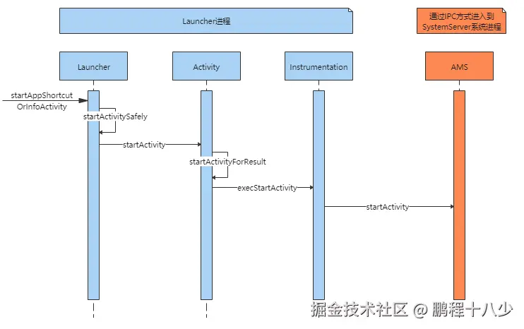 1、点击桌面App图标,Launcher进程采用Binder IPC向system_server(AMS)进程发起startActivity请求;(launcher----AMS)