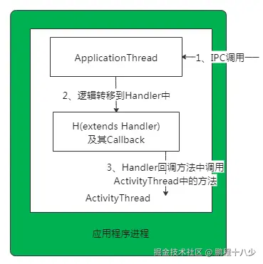 ApplicationThread- 在Binder线程接收请求H(Handler) - 切换到主线程执行