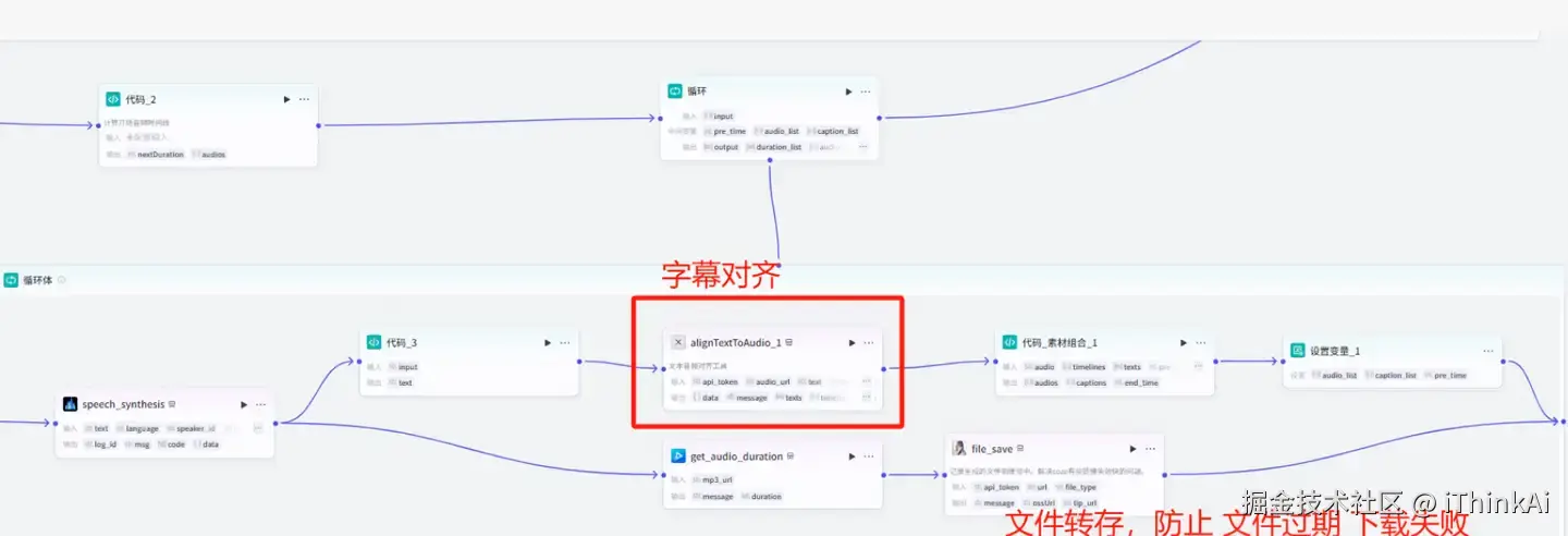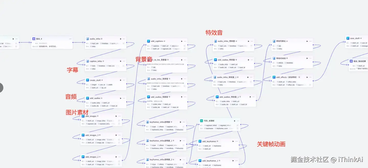 1.通过前置节点准备背景音乐与特效音效2.用豆包大模型生成分镜脚本与英文口播稿3.调用剪映插件实现音画精准对齐4.自动转存生成文件至永久存储空间完整工作流