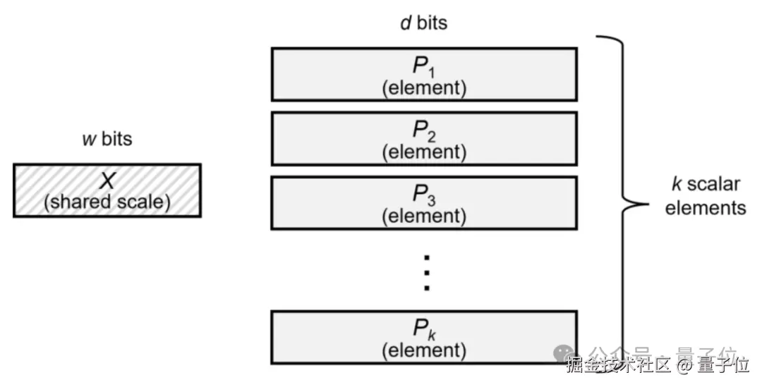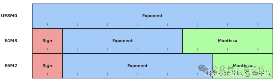 而这里的 “缩放因子” 也是包含 8 个 bit,其中包含符号位、指数位和尾数位,开发者可以自行将这 8 个 bit 分配给这三种不同的位。