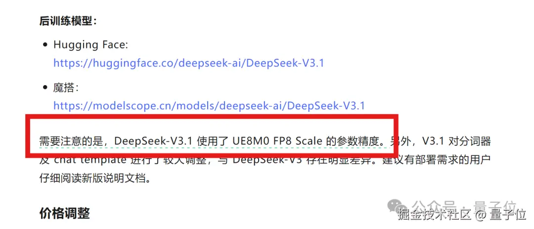 需要注意的是,DeepSeek-V3.1 使用了 UE8M0 FP8 Scale 的参数精度。
