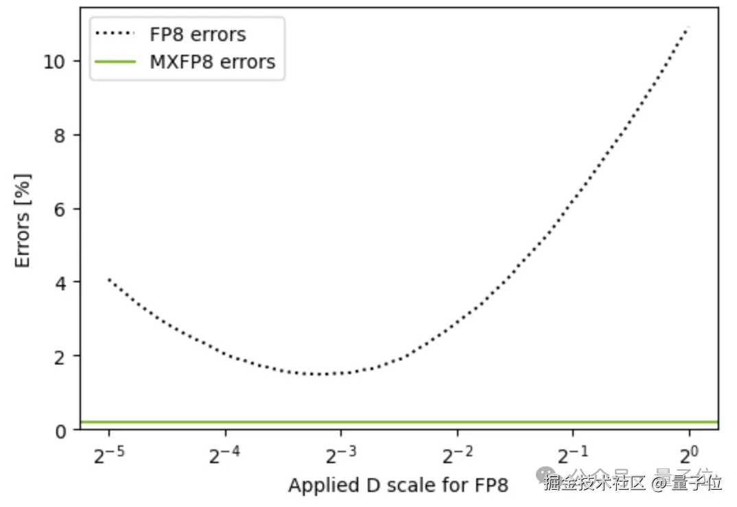 这种块级(而不是全张量级)的缩放,让 MXFP8 既保留了 8 bit 位宽,又把可用动态范围扩展了几十倍。