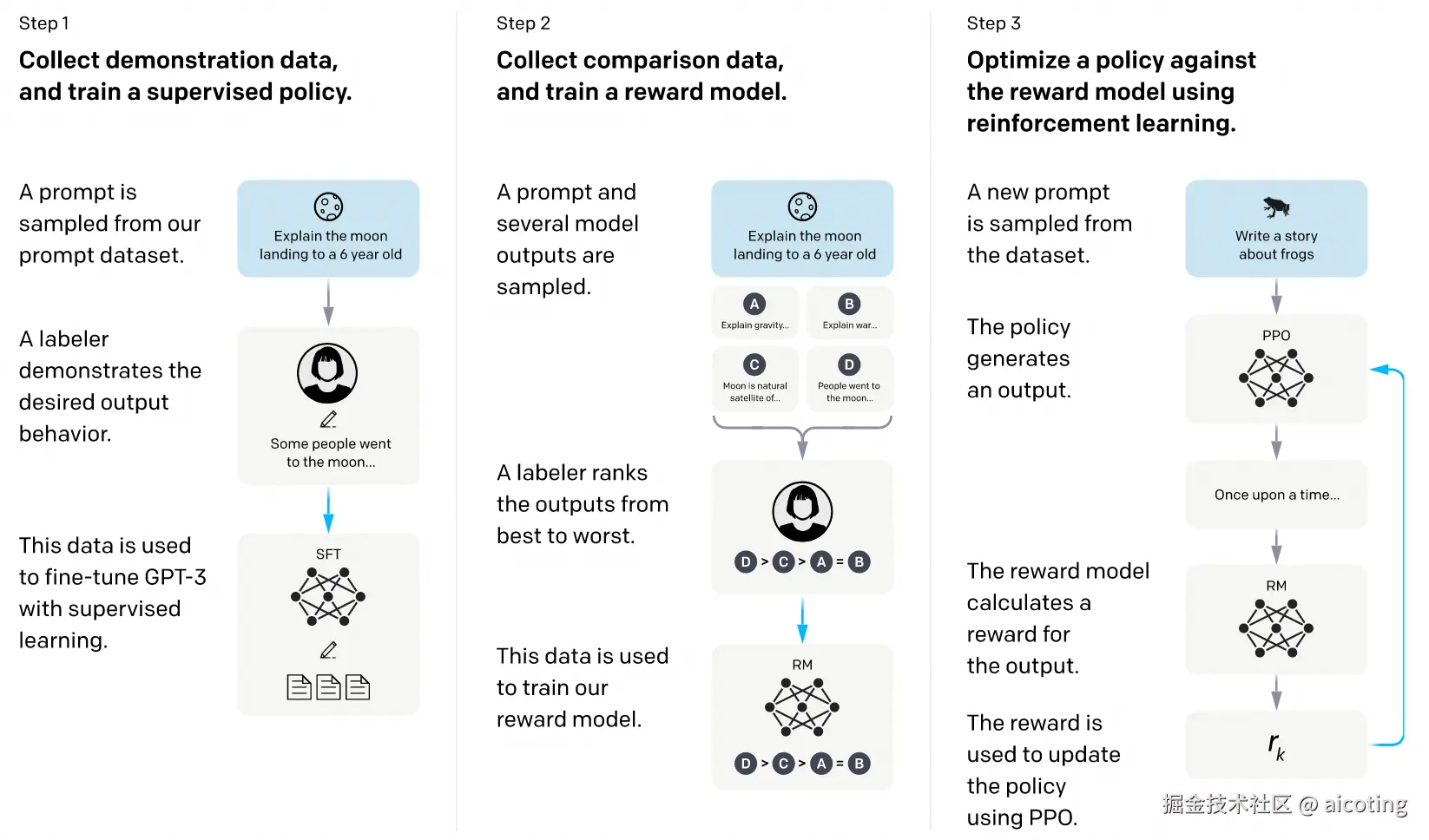 - RLHF:监督微调 + 奖励模型 + 强化学习