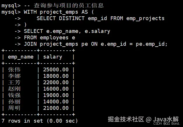 -- 找出每个部门薪资高于部门平均且参与项目的员工