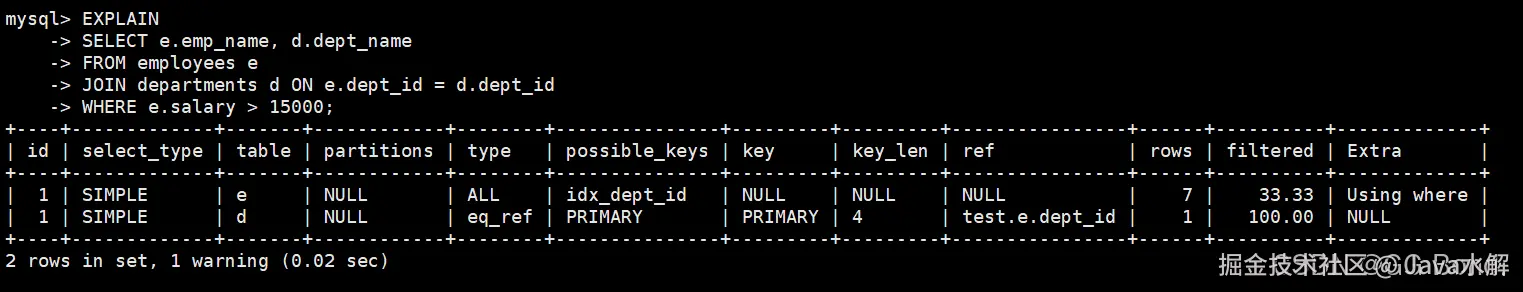 EXPLAIN SELECT e.emp_name, d.dept_name FROM employees e JOIN departments d ON e.dept_id = d.dept_id WHERE e.salary > 15000; AI写代码sql -