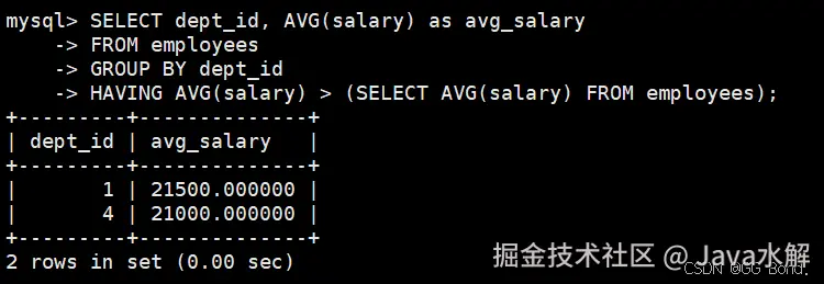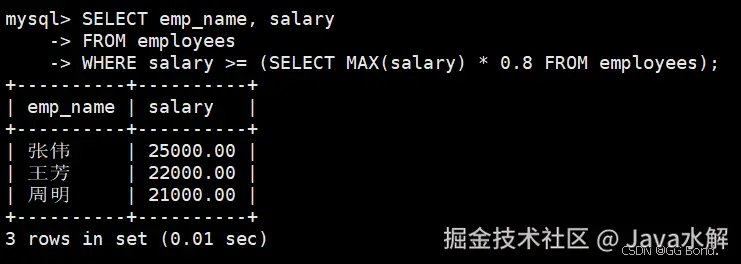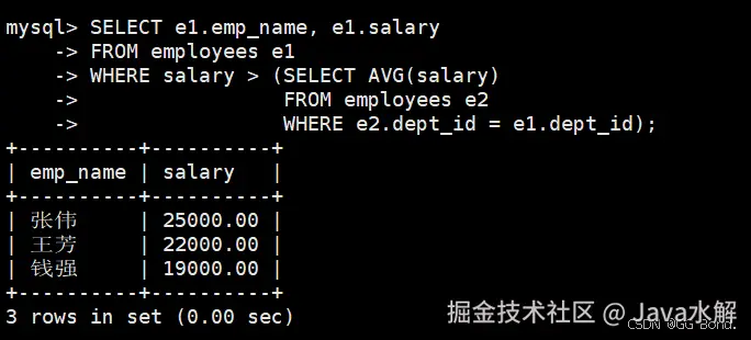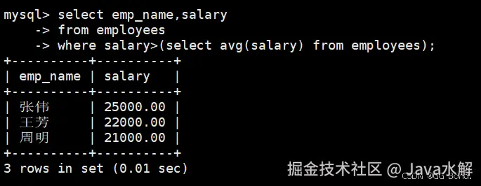 SELECT emp_name, salary FROM employees WHERE salary > (SELECT AVG(salary) FROM employees); AI写代码sql -
