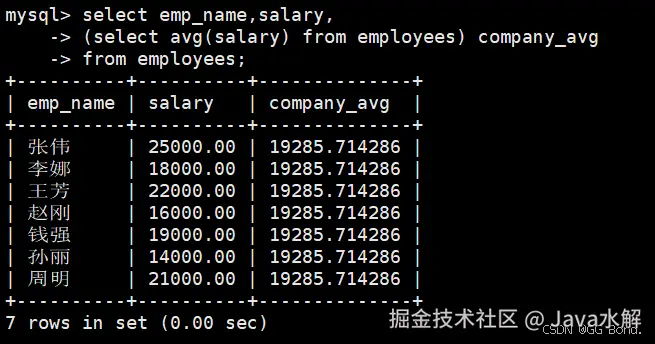 SELECT emp_name, salary, (SELECT AVG(salary) FROM employees) as company_avg FROM employees; AI写代码sql -