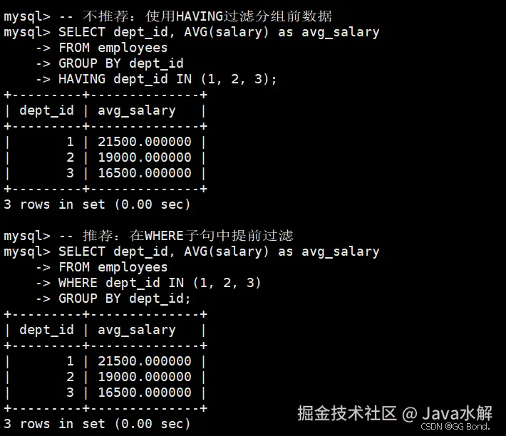-- 不推荐:使用HAVING过滤分组前数据 SELECT dept_id, AVG(salary) as avg_salary FROM employees GROUP BY dept_id HAVING dept_id IN (1, 2, 3); -- 推荐:在WHERE子句中提前过滤 SELECT dept_id, AVG(salary) as avg_salary FROM employees WHERE dept_id IN (1, 2, 3) GROUP BY dept_id; AI写代码sql