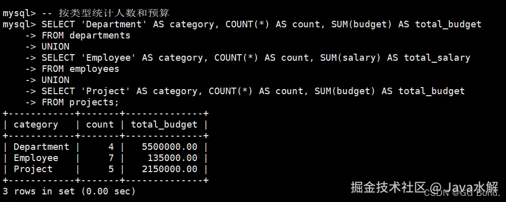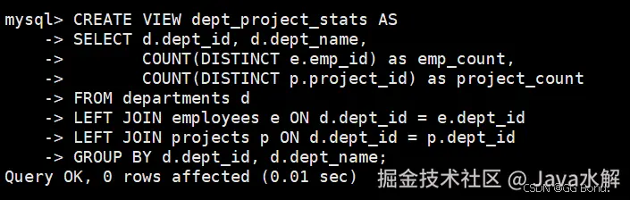 CREATE VIEW dept_project_stats AS SELECT d.dept_id, d.dept_name, COUNT(DISTINCT e.emp_id) as emp_count, COUNT(DISTINCT p.project_id) as project_count FROM departments d LEFT JOIN employees e ON d.dept_id = e.dept_id LEFT JOIN projects p ON d.dept_id = p.dept_id GROUP BY d.dept_id, d.dept_name; AI写代码sql