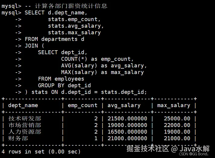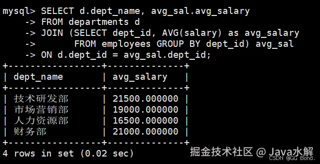 SELECT d.dept_name, avg_sal.avg_salary FROM departments d JOIN (SELECT dept_id, AVG(salary) as avg_salary FROM employees GROUP BY dept_id) avg_sal ON d.dept_id = avg_sal.dept_id; AI写代码sql -