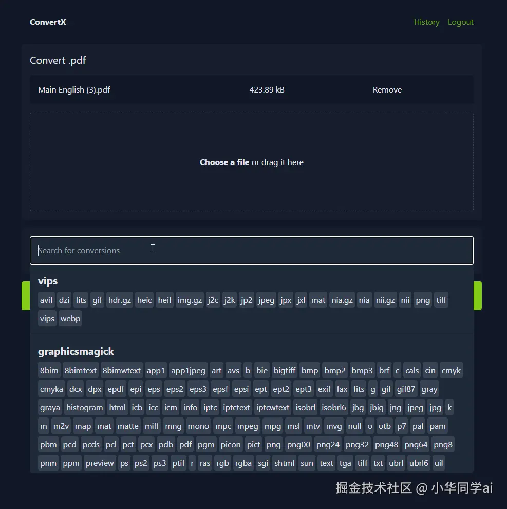 - 批量处理 & 历史记录:可以一次上传多文件,转换完成后查看详细历史记录。