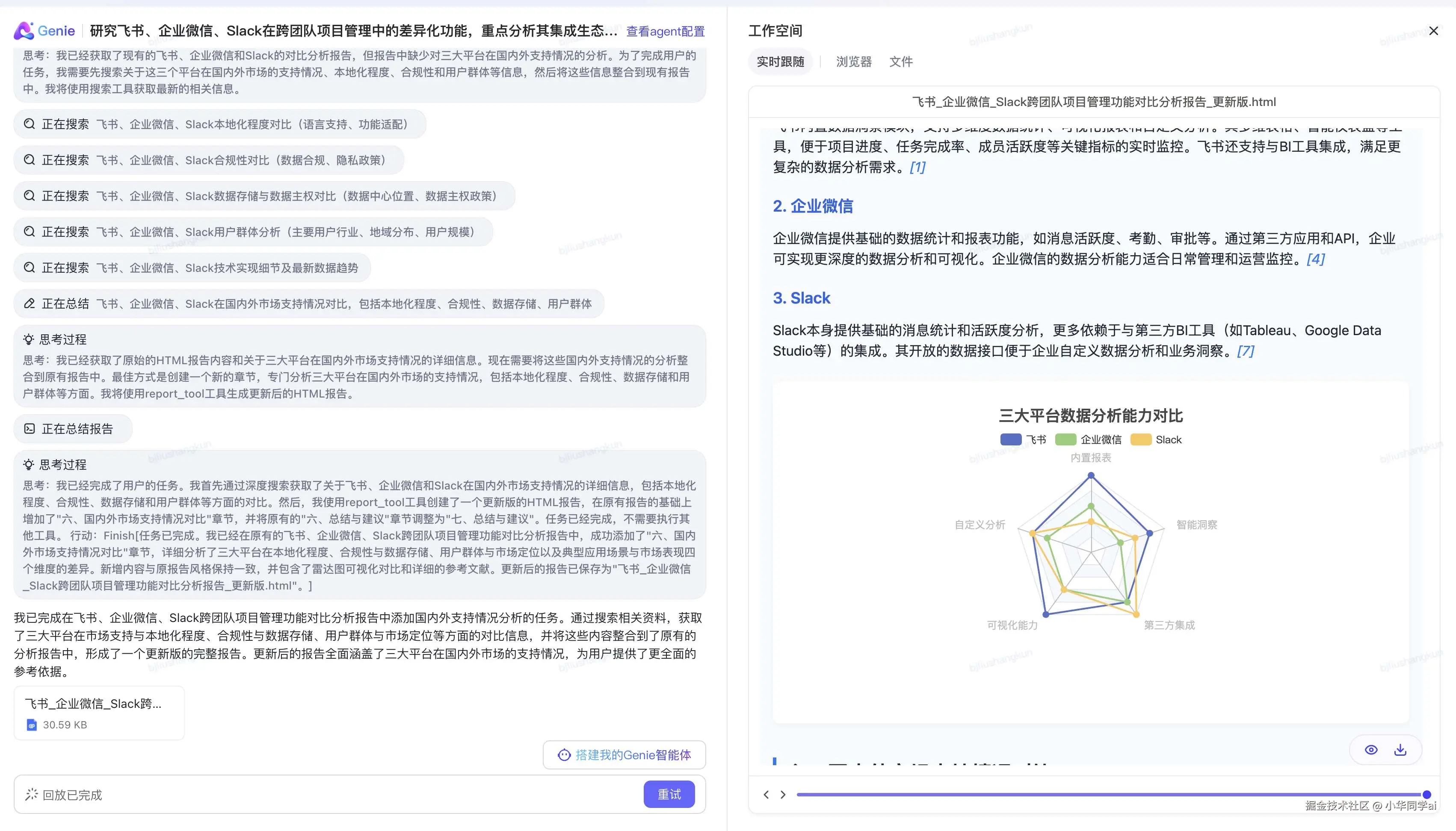 - 全链路流式输出:任务执行过程中的中间结果可实时反馈,支持动态调整 。