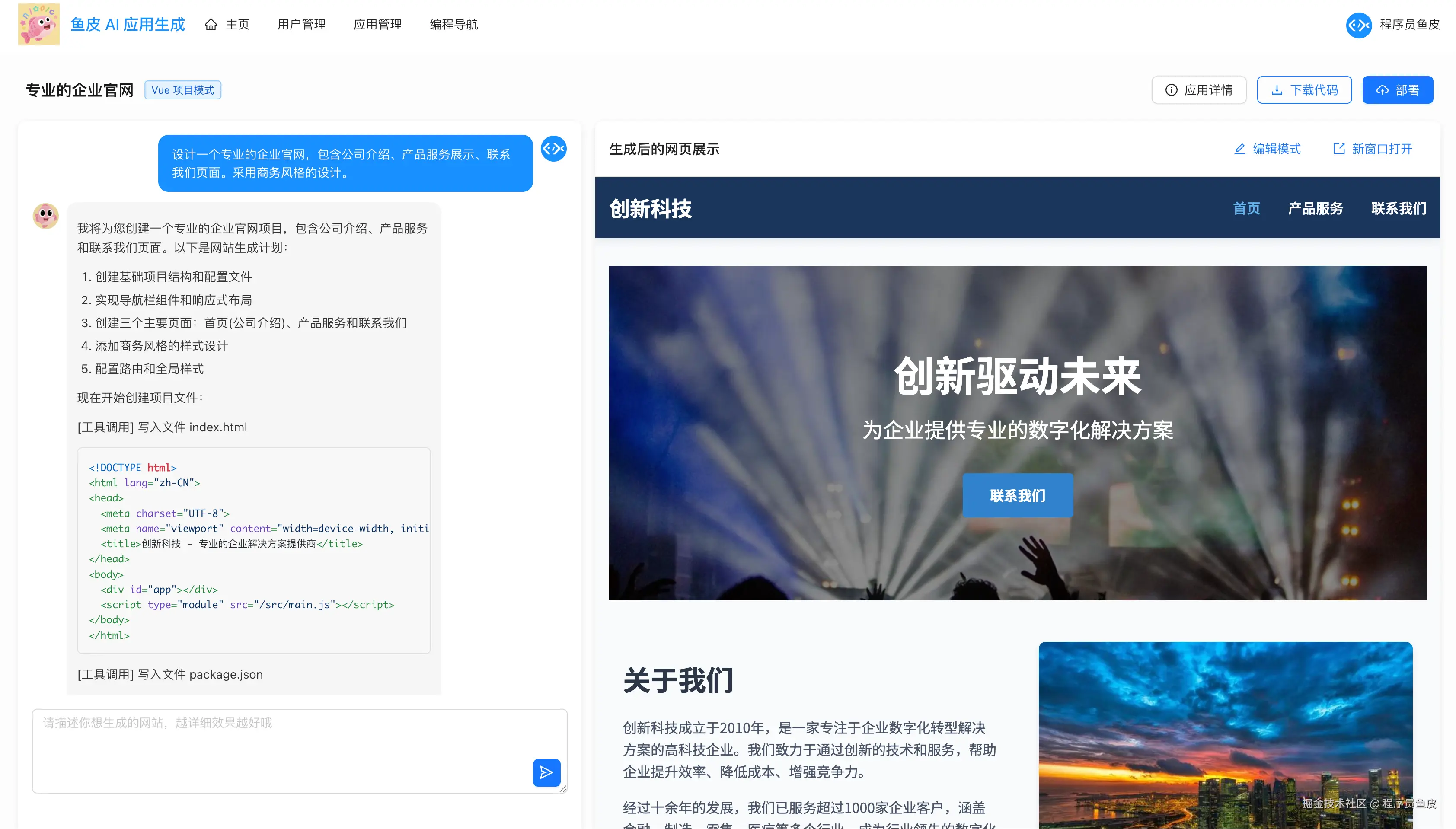 大家好,我是程序员鱼皮。之前已经带大家完成了 AI 零代码应用生成平台 的核心功能,能够一句话生成复杂网站,并支持实时浏览和可视化修改。