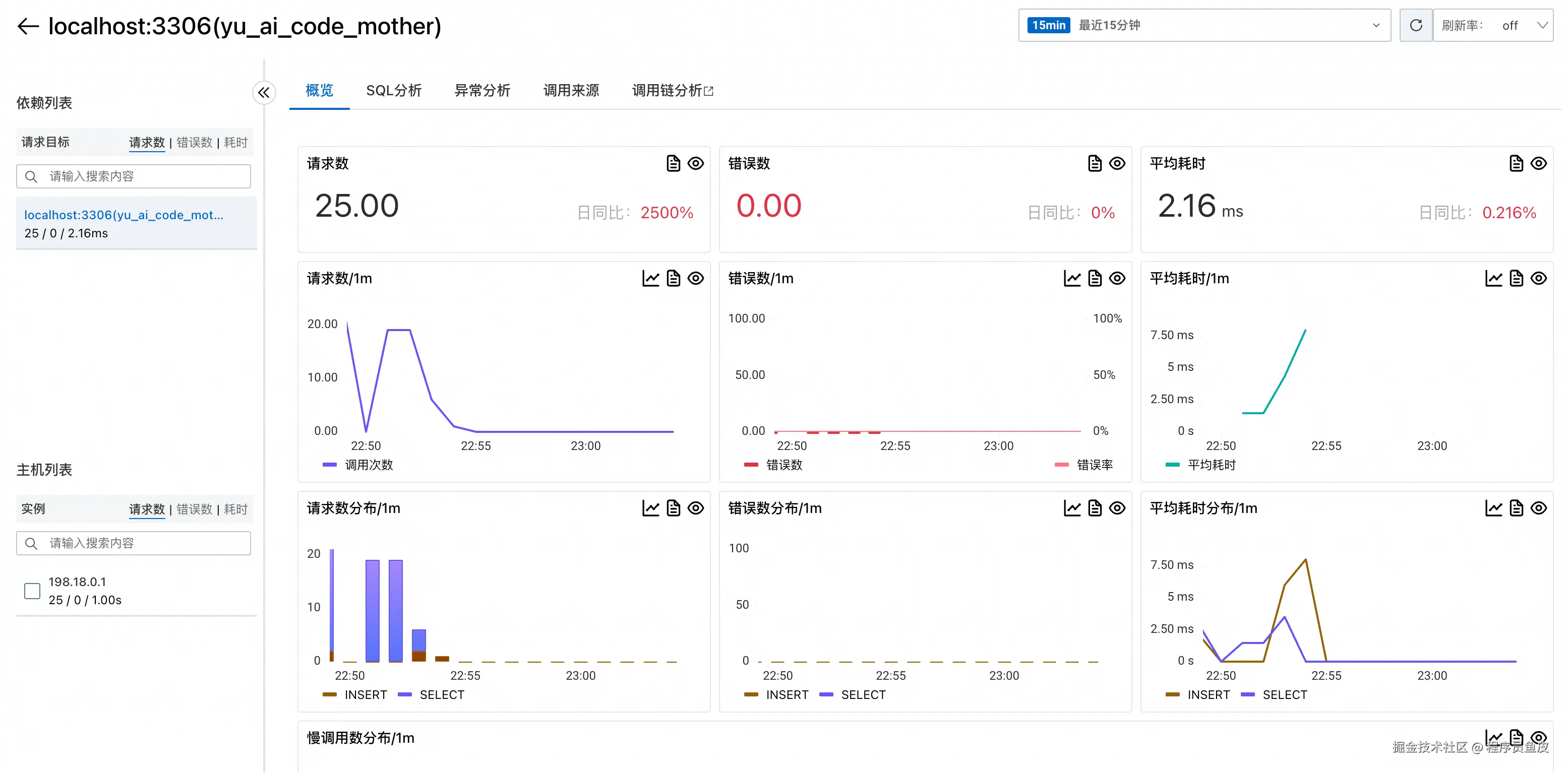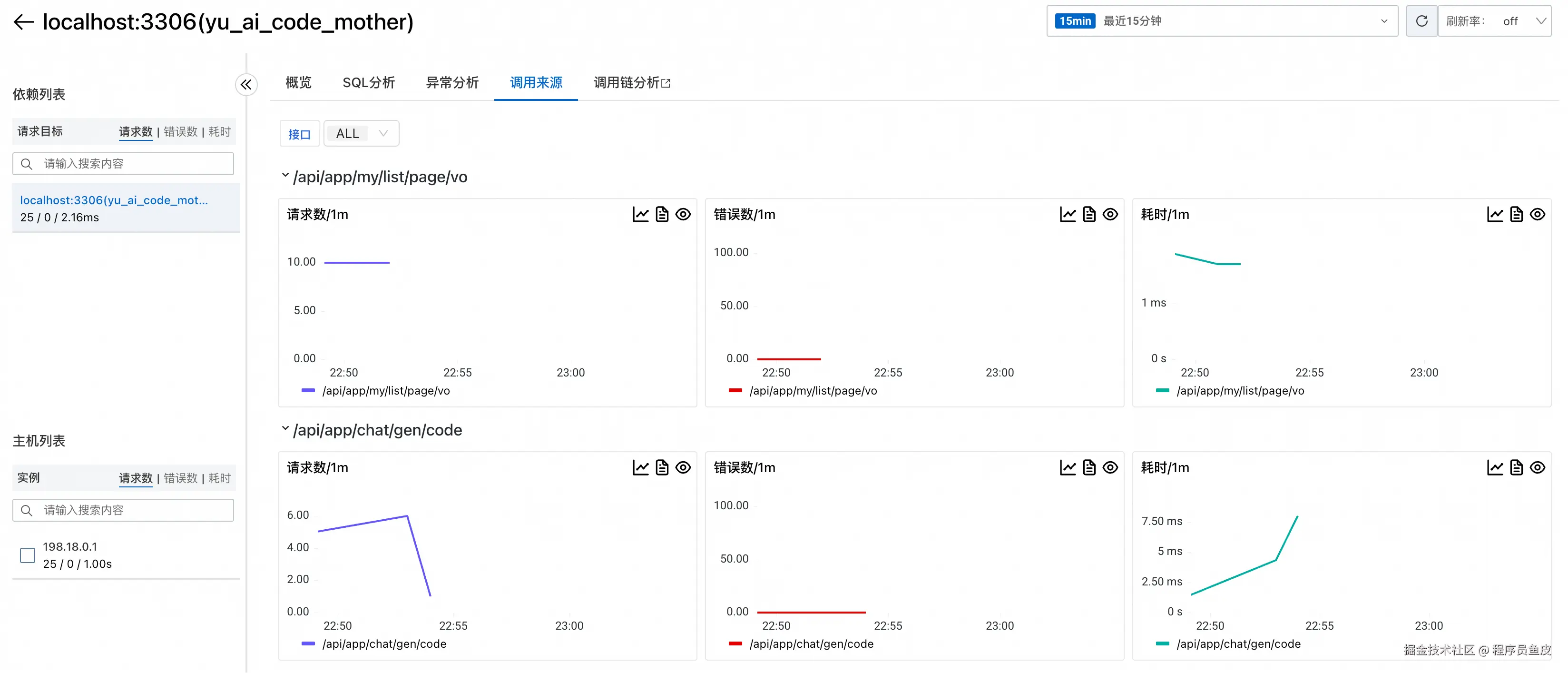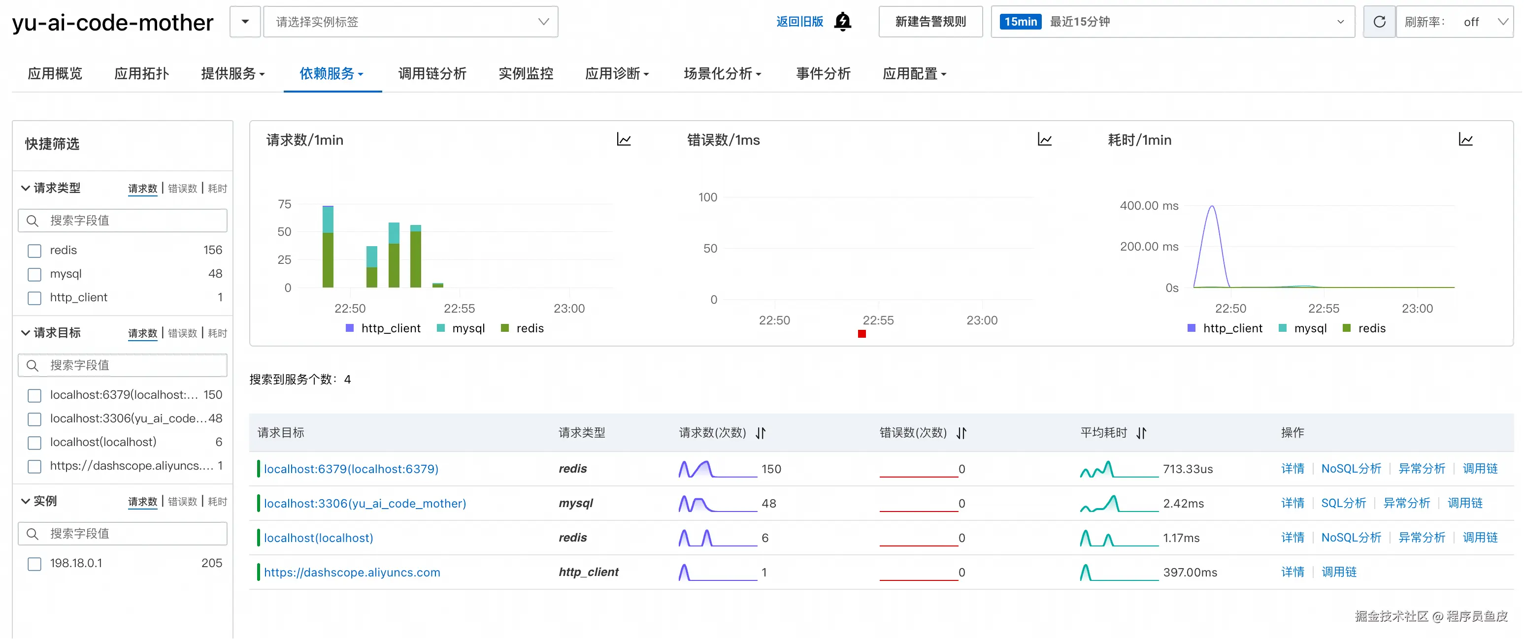 依赖服务页面专门监控应用对外部服务的调用情况,比如数据库、缓存等:
