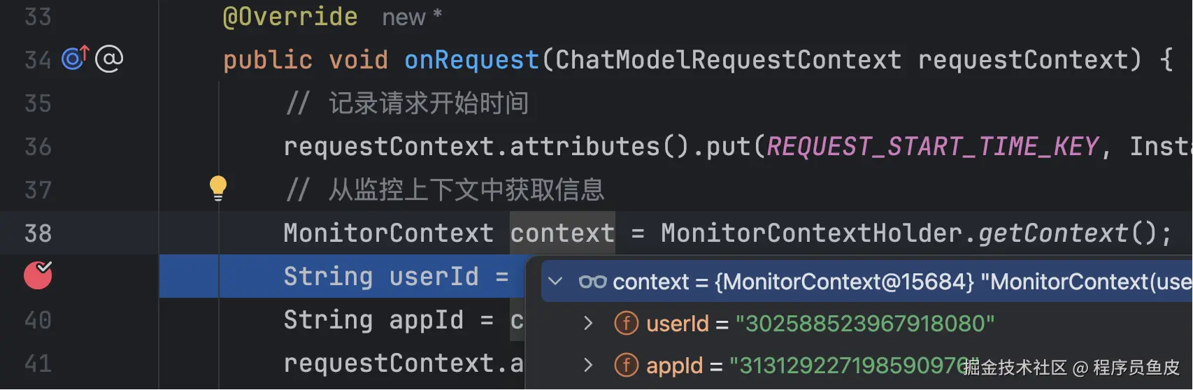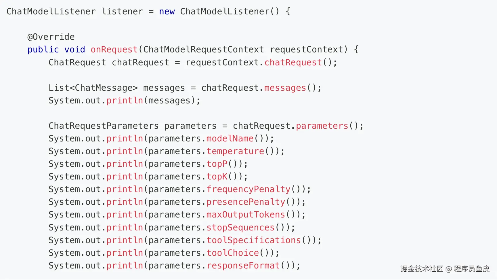 编写 LangChain4j 监听器来触发指标收集,这是整个监控体系的核心。下面列举监听 AI 请求和响应的代码: