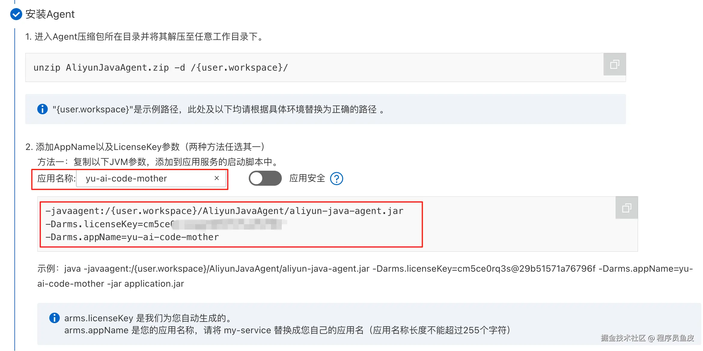 复制启动命令,注意替换目录路径和应用名称。你也可以选择开启应用安全功能,它能够提供 应用层面的安全监控能力,帮你抵御一些漏洞攻击。