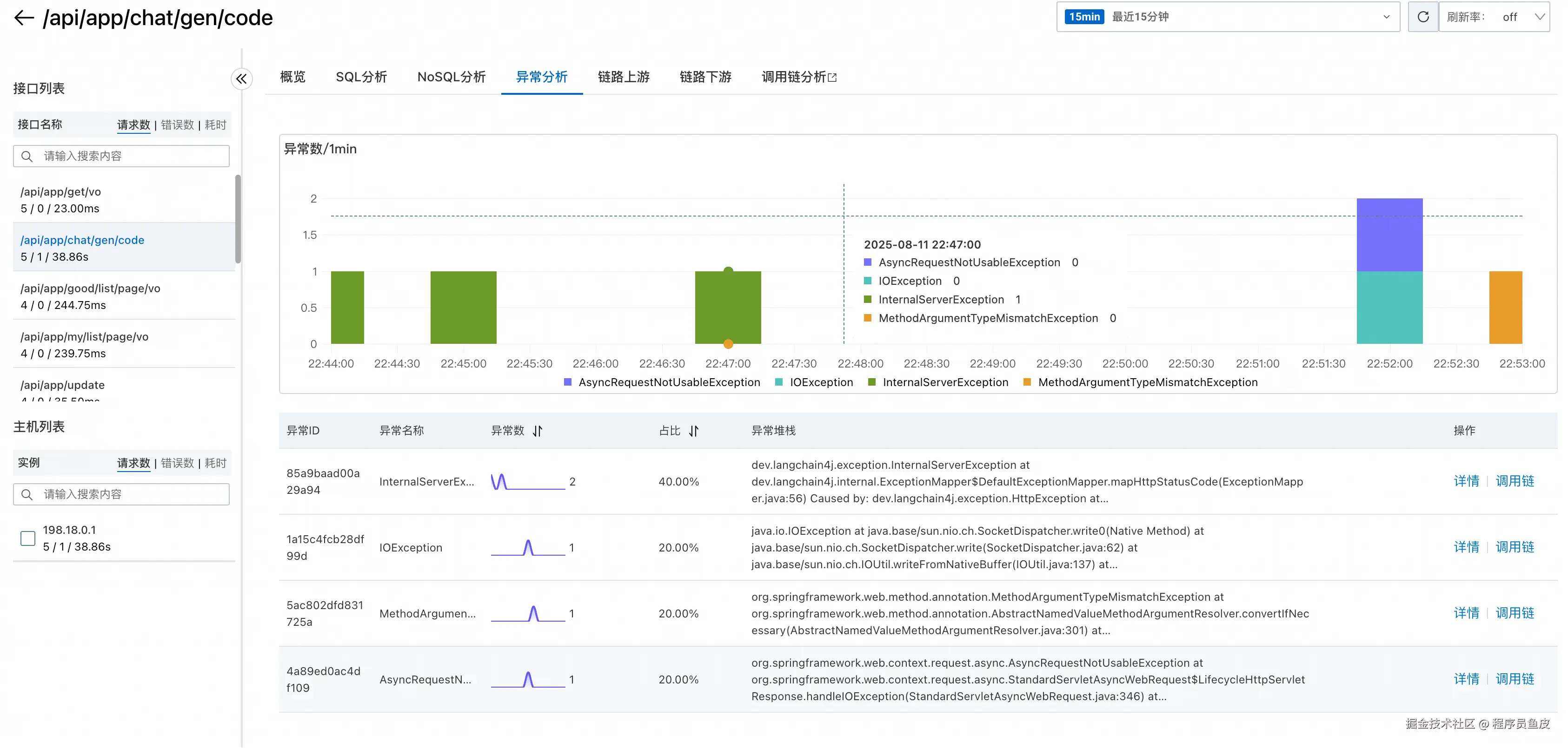 还提供了异常分析功能,可以帮助快速定位和解决应用中的异常问题: