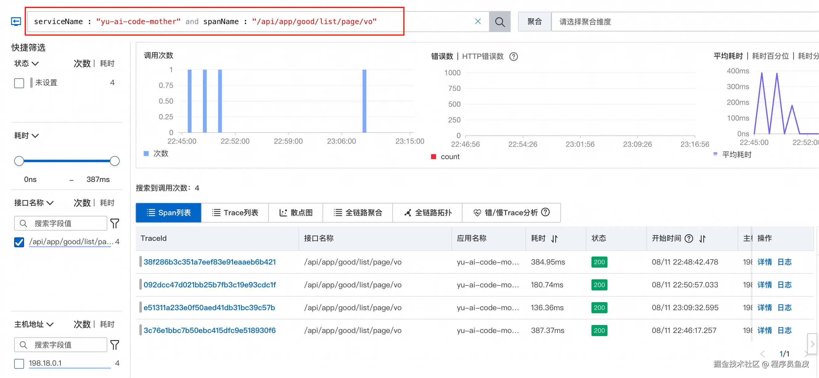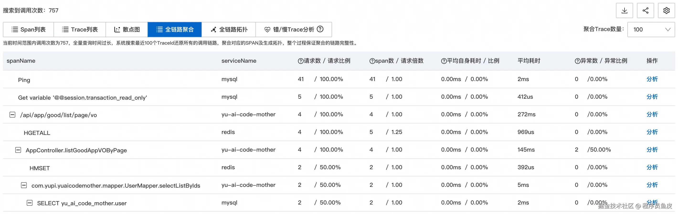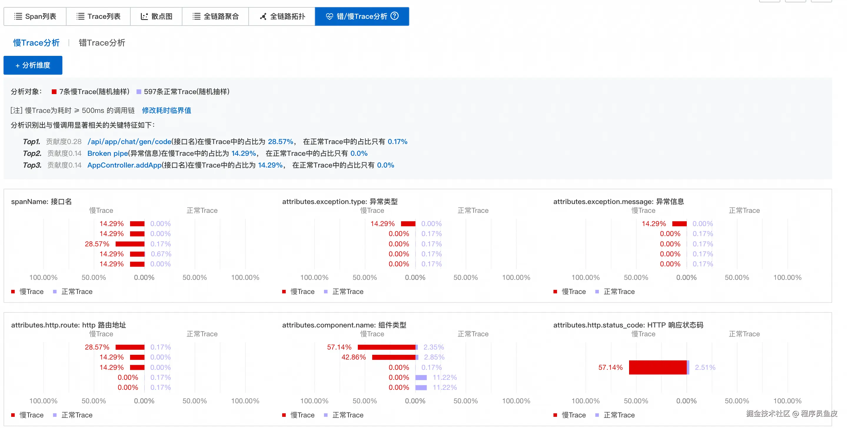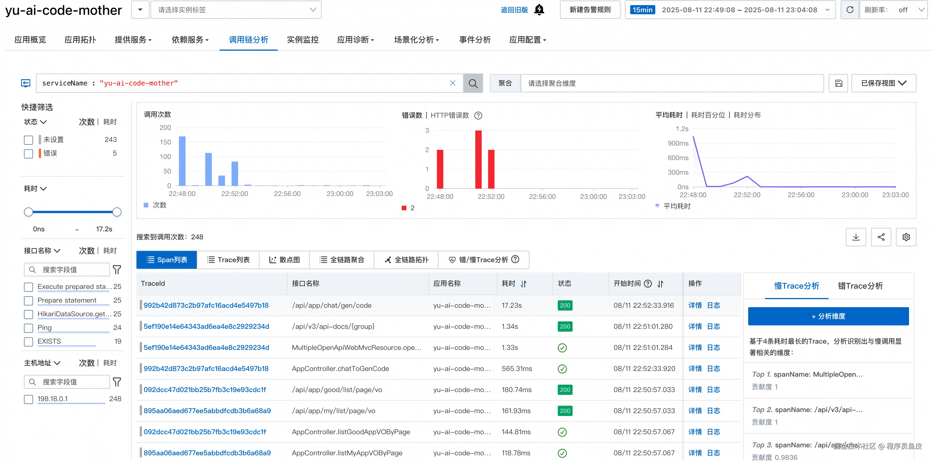 其中,错误 / 慢 Trace 分析功能特别实用,能够一秒定位到性能瓶颈: