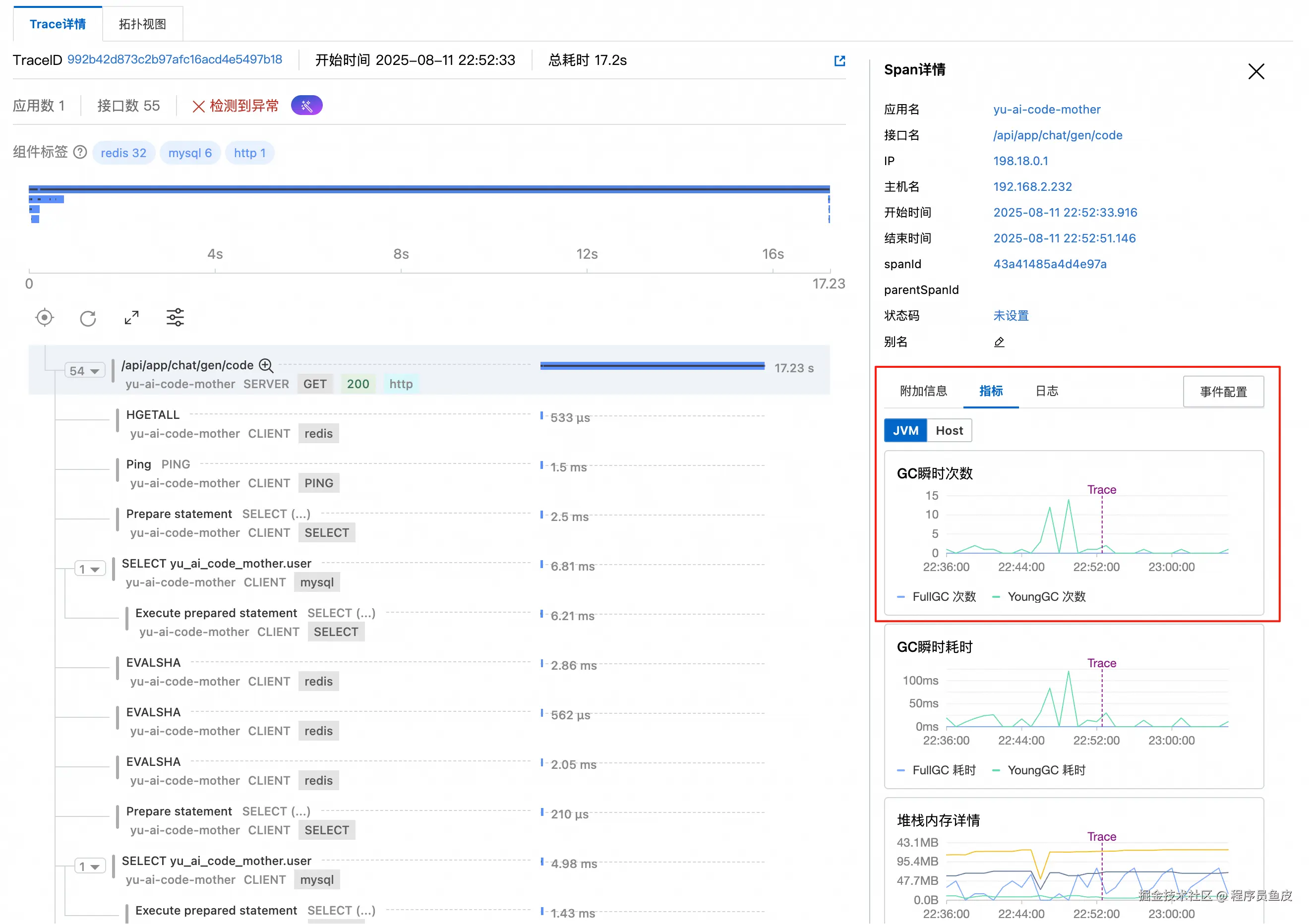 点击具体的调用记录,在 Trace 详情页面可以看到请求经过的每个环节和对应的耗时,右侧还能显示当时的 JVM 状态: